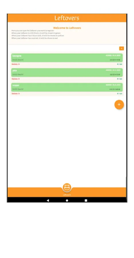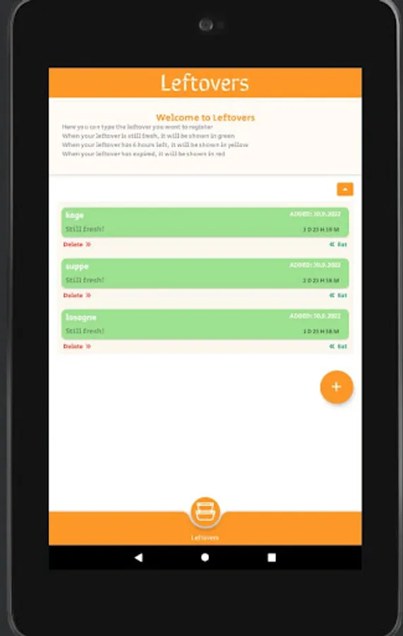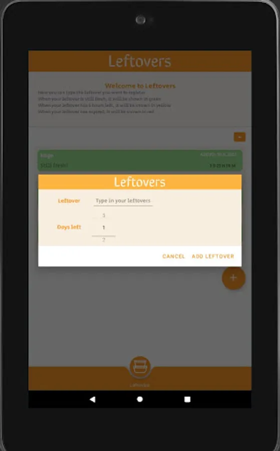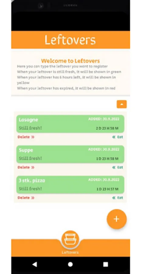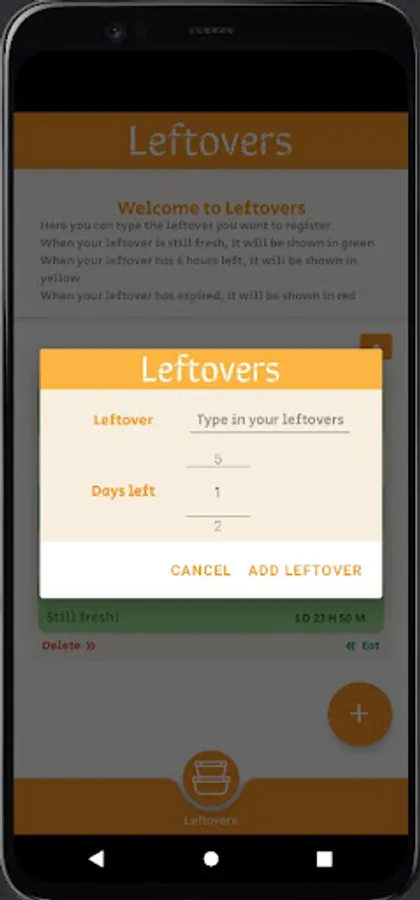 Leftovers er et nyt koncept, der med et overskueligt og pænt design inviterer dig, til at logge dine 'leftovers'. Du giver din rest et navn fx: 'lasagne' og hvor længe du tænker den vil kunne holde sig i køleskabet. Du kan vælge mellem 1-5 dage, da det typisk er i dette interval, mad kan holde sig. Den vil blive markeret med grøn, gul, eller rød farve alt efter holdbarhedsdatoen. Er den grøn er den sikker at spise, er den gul skal du skynde dig, og er den rød, så skal det i skraldespanden.