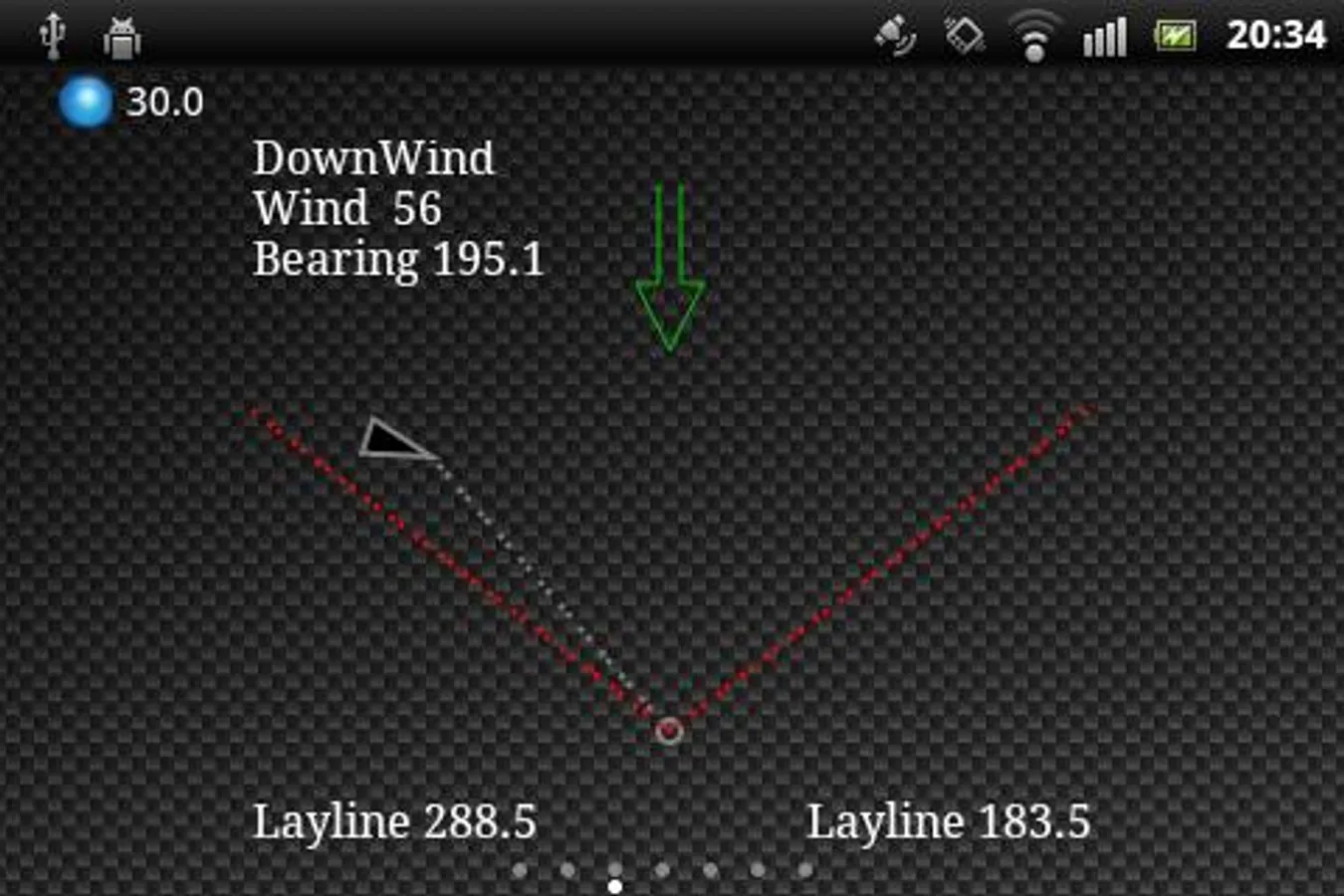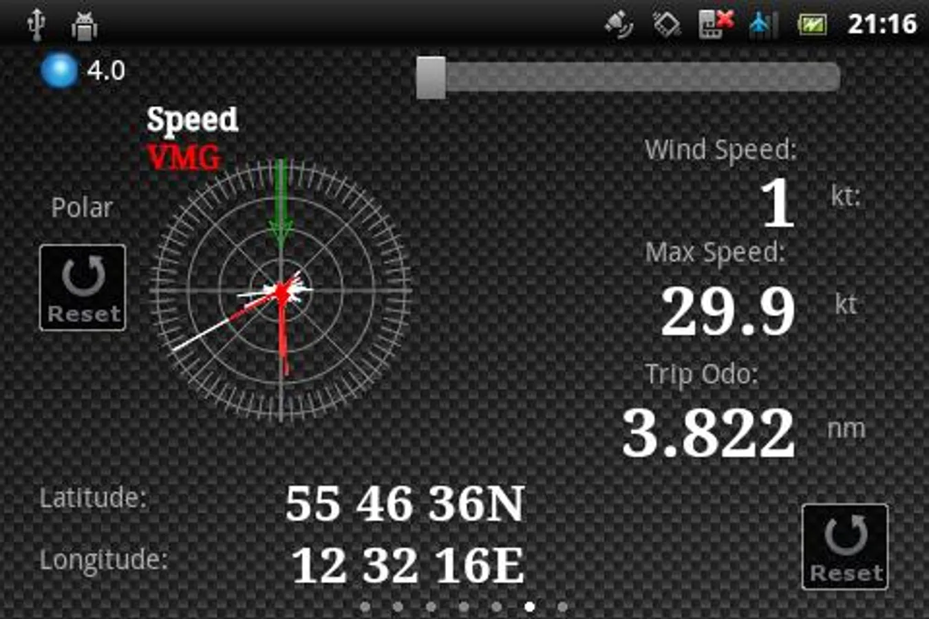 Here you can see your location (Lat & Lon), Max speed and Trip odometer. On the left hand side there is a polar diagram. tap it and it'll increase in size. Change the wind speed to see the different polars. These polars are the base for the performance bar in the race view.