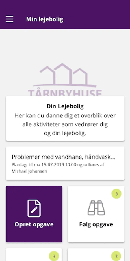 As a resident of the Housing Organization Tårnbyhuse, you can use this to send error messages to your manager, get information about your lease and receive operational messages on acute problems, etc. You will receive your login information from Tårnbyhuse. If you have not yet received this, you can contact the administration at 32 50 49 00