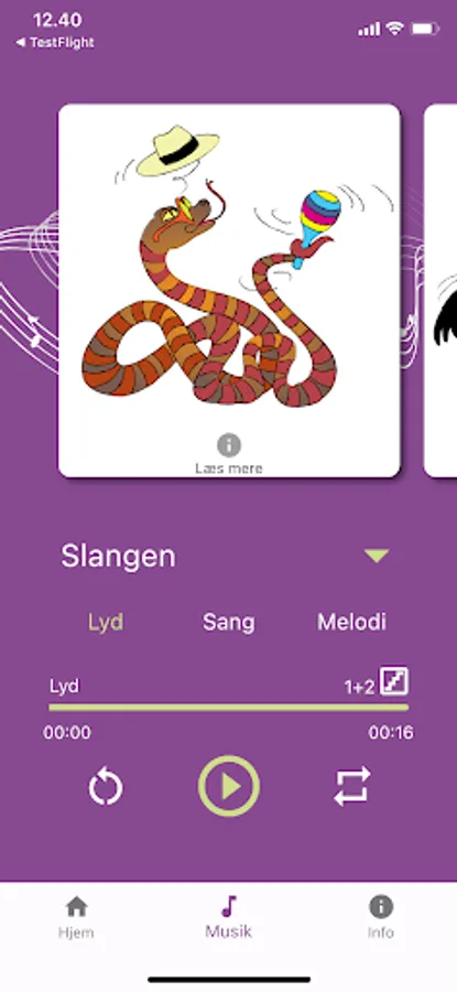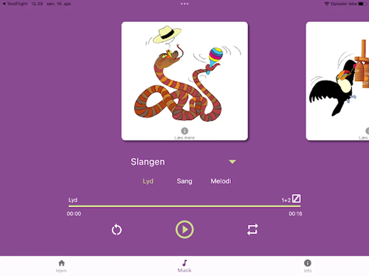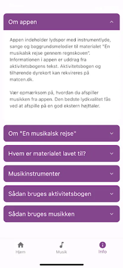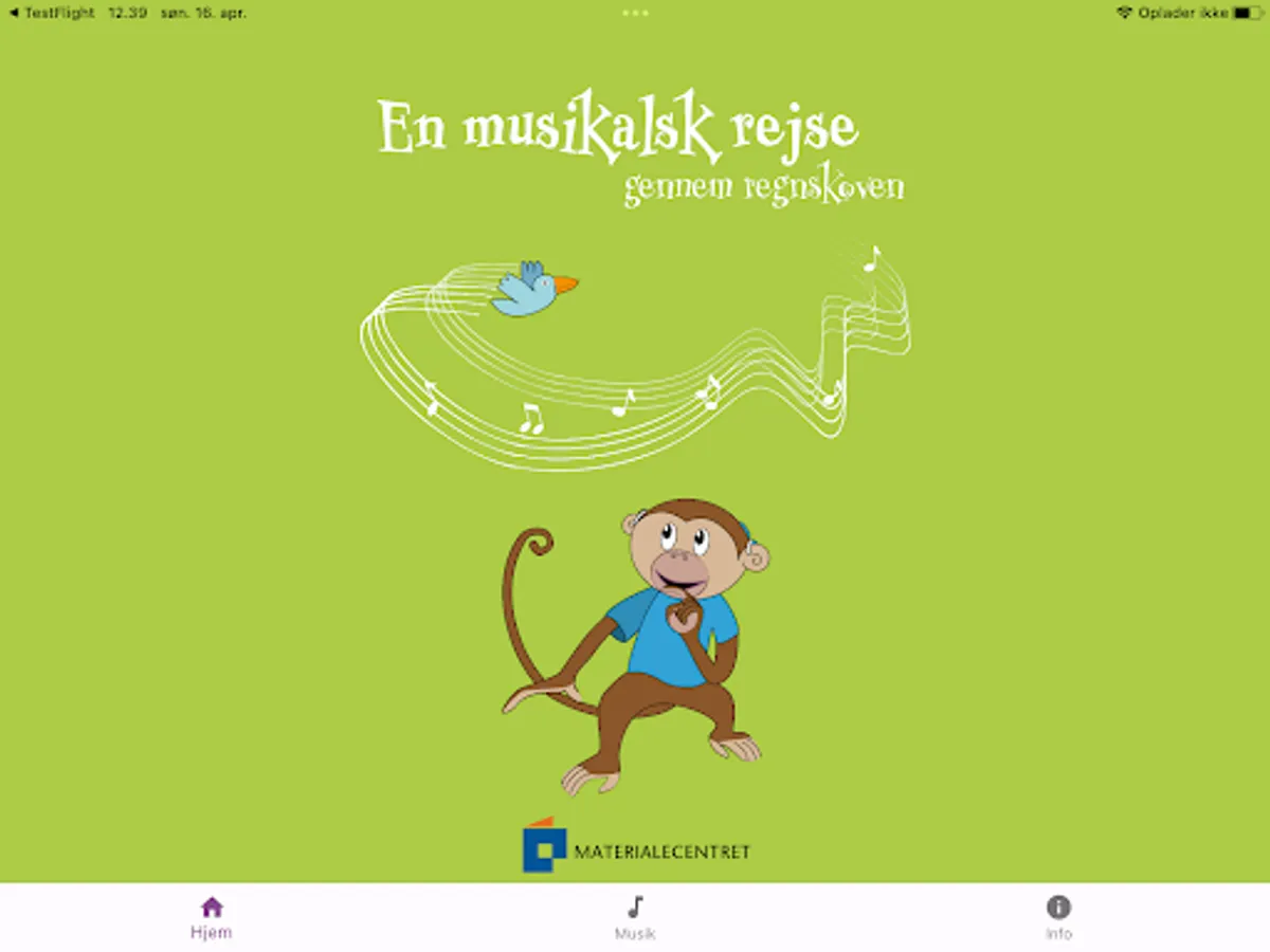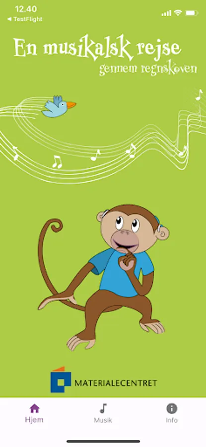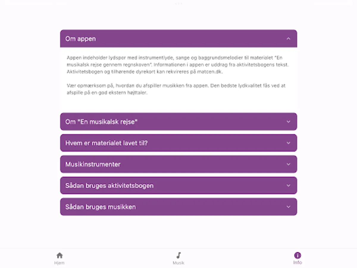 The app contains soundtracks with instrument sounds, songs and background melodies for the material. In addition to the app, "A musical journey through the rain forest" consists of an activity book and some animal cards. Both parts can be ordered from Materialecentret, matcen.dk.