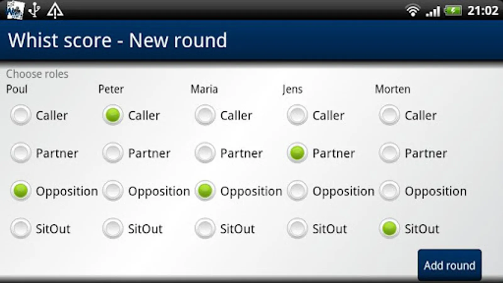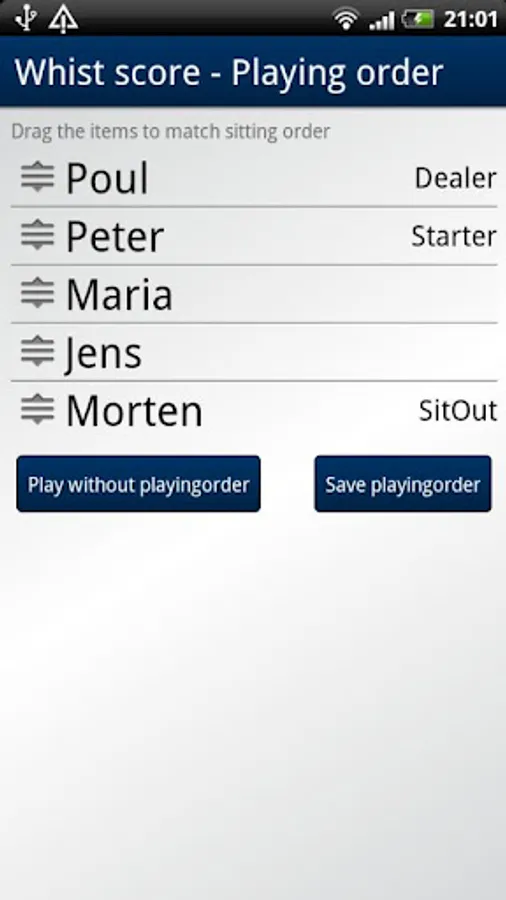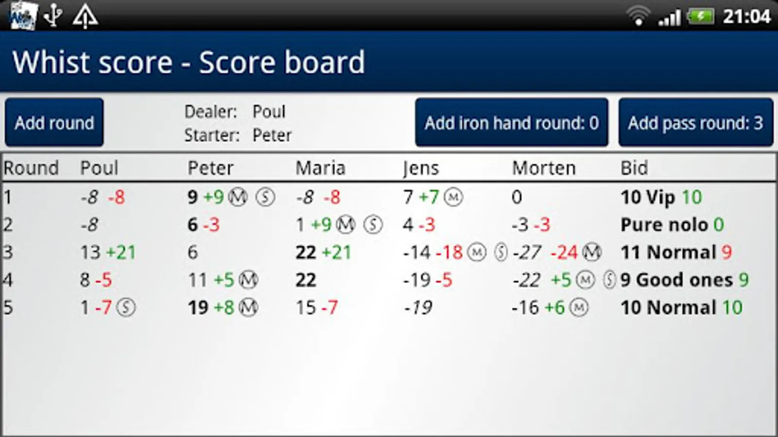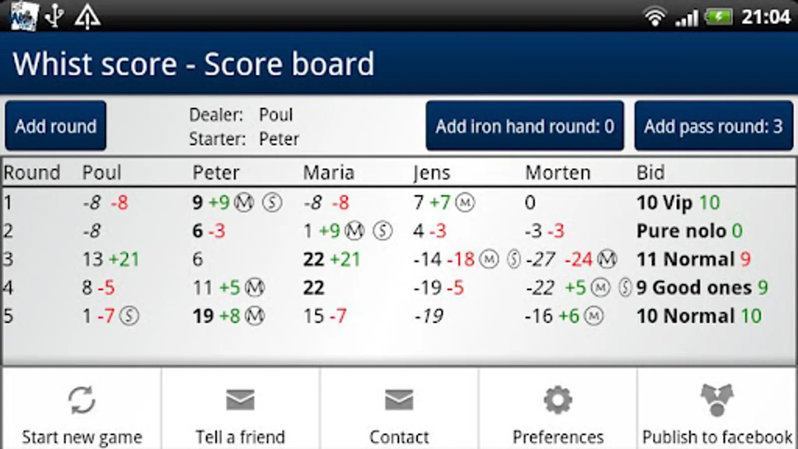 This is a tool to make it easy for you to calculate score in the card game Whist. Calculate the score for round quickly and get a good overview over the game tendencies on the scoreboard. Choose the playing order and the dealer, starter and sit out roles will automatic be determined.