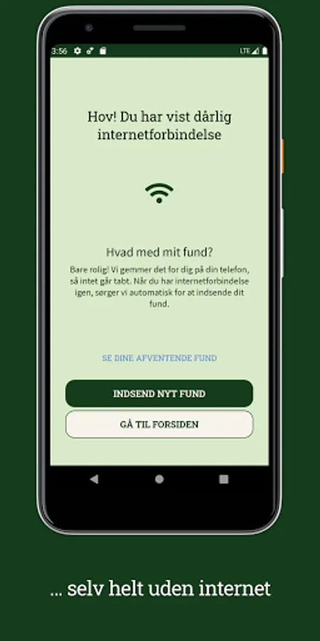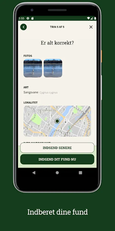 If you select "Insert new find" on the front page of the app, you will be guided through 5 steps to report your find. If you are in an area without an internet connection, the find will automatically be reported to arter.dk when you are connected again. However, it requires that you download offline maps under the settings at the top right of the front page before heading out into nature.