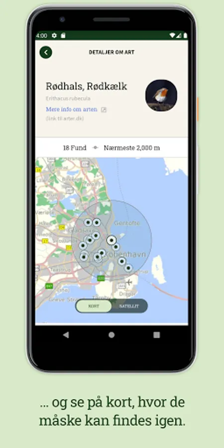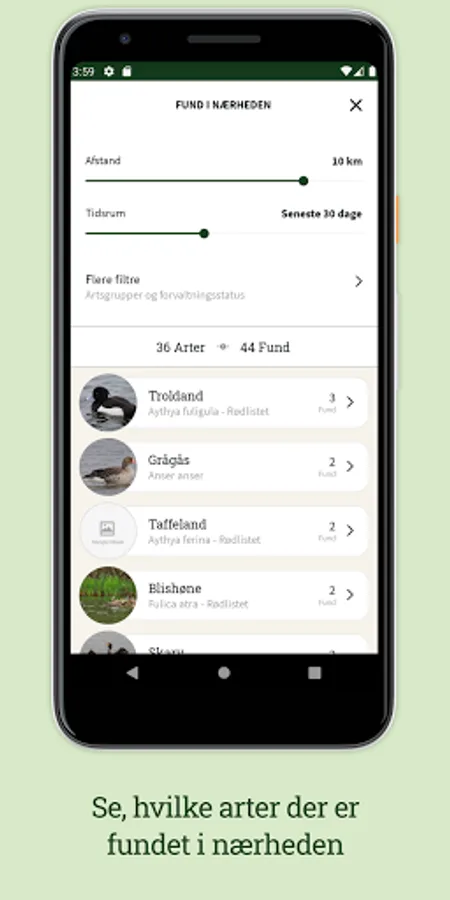 On the front page, you can also choose to "see finds nearby". Here you can see which finds have been made within some defined distances and time periods, for example within 1 kilometer distance in the last 30 days. The individual results contain a link to the Species Book on arter.dk. If you need a more detailed picture of the deposits, you should also visit arter.dk, as the app is only a very simple app to take out into nature.