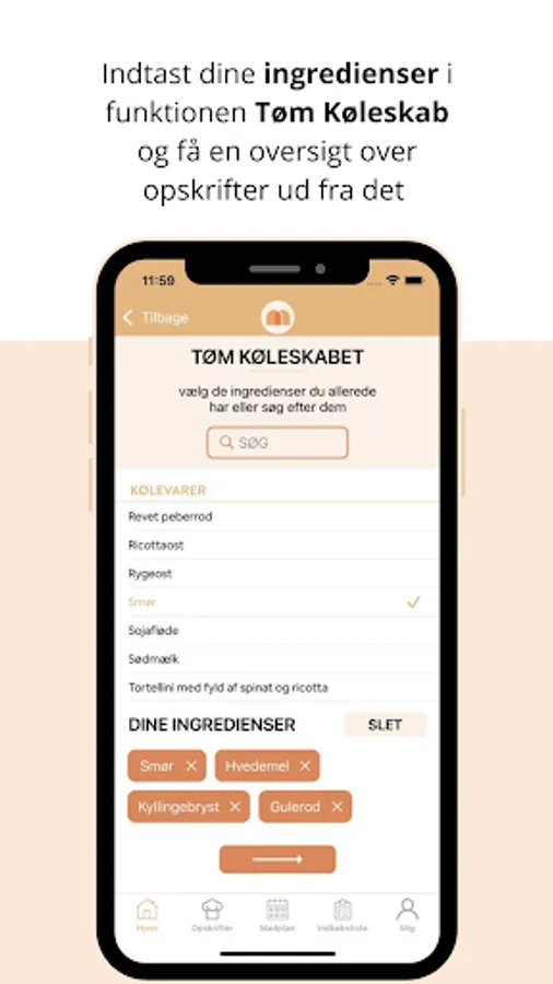 - Tøm køleskabsfunktion, hvor du kan indtaste de ingredienser du har