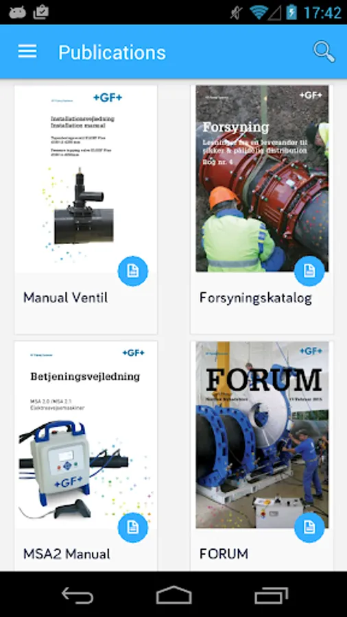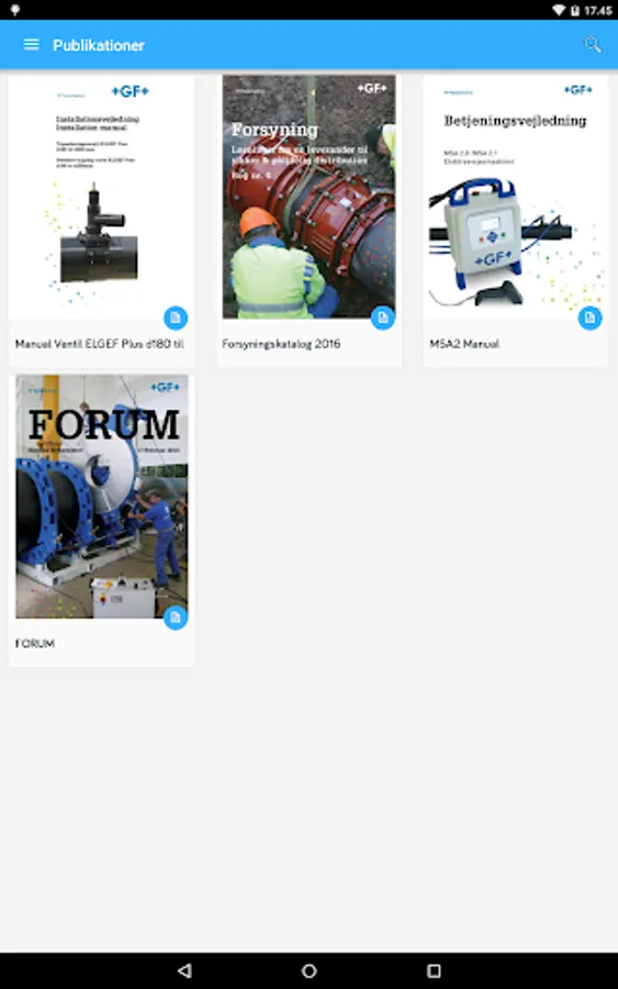 GF Nordic App giver et unikt overblik og adgang til GF's dokumentationsmateriale. Her findes altid de nyeste produktkataloger, tekniske informationer og manualer. Brugeren har mulighed for at abonnere på nyheder og modtager en push-beskeder så snart en nyhed præsenteres. Man kan også altid gå tilbage og tjekke nyheder, læse GF’s Nordiske kundemagasin FORUM eller finde relevante produkt-videoer.