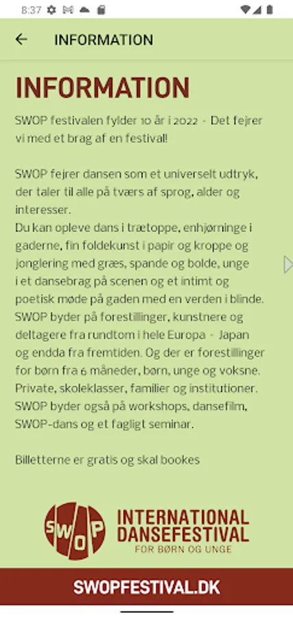 Every other year is SWOP year, where spring is colored by the festival's wealth of dance performances and activities. Where streets, stages and squares form the basis for festive gatherings in Roskilde - for children, young people and adults who meet for high-quality artistic experiences. Where Roskilde is the heart of an international, unique event.