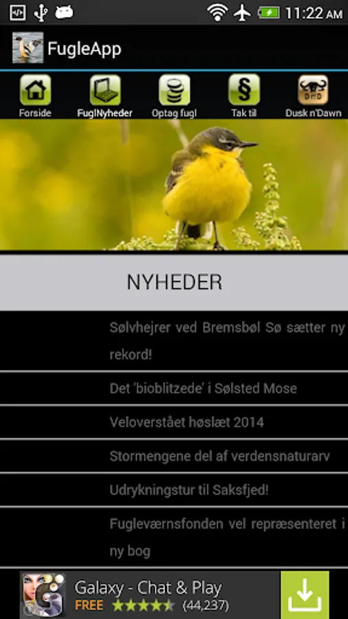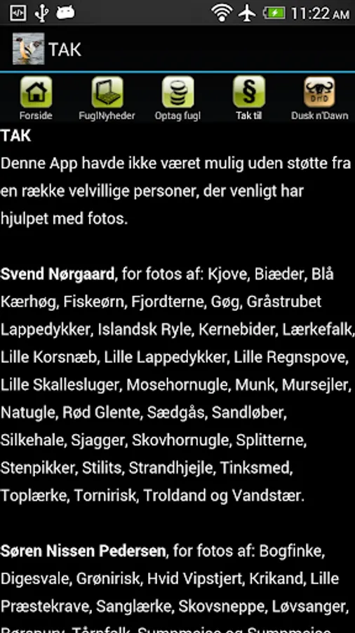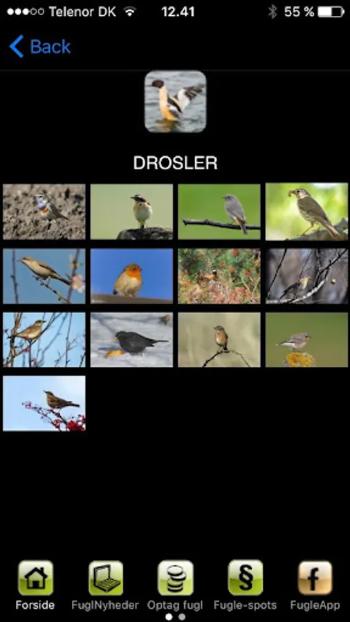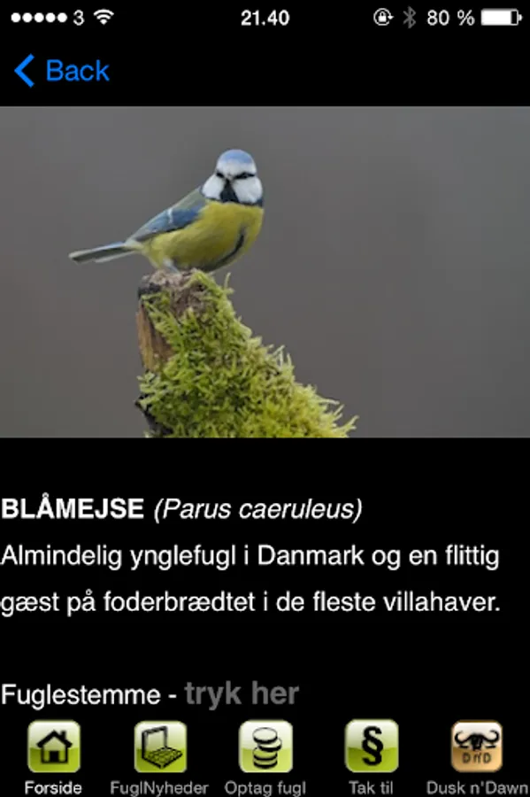 Here you have all of Denmark birds at your fingertips, so you can easily find out which bird you have in the garden or looking at the picnic. You can also hear how the bird's voice sounds.
