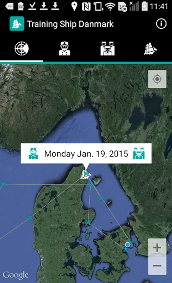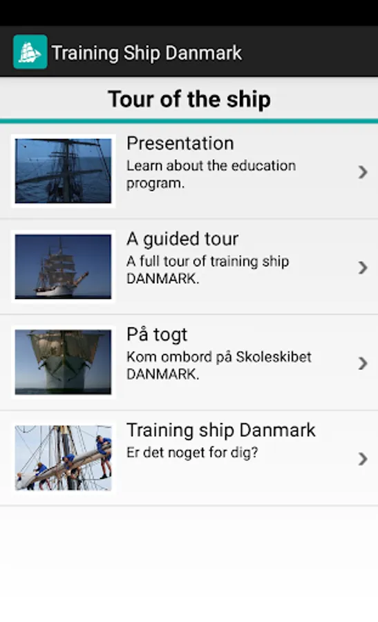 This app er blevet available to all users by a generous donation from THE DANISH MARITIME FUND. It is available on Google Play free of charge to any one Who is interested. The app is optimized for Android 3.0 and later versions. The purpose of the app er provide information about how to start a maritime carrier in The Blue Denmark onboard the Training Ship Denmark. It shows Training Ship Denmark's siste or current voyage with the Daily waypoints. The "old" voyage will förbli on the app until a new starts. Du kan read diaries from the captain and the crew. The diaries will be updates on a daily basis whenever possible.