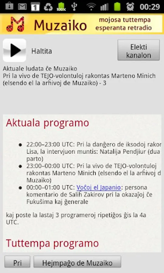 - Muzaiko, la tuttempa tutmonda tutmojosa retradio en Esperanto, kun muziko, novaĵoj, informoj, raportoj, arkivaĵoj kaj multe pli.
