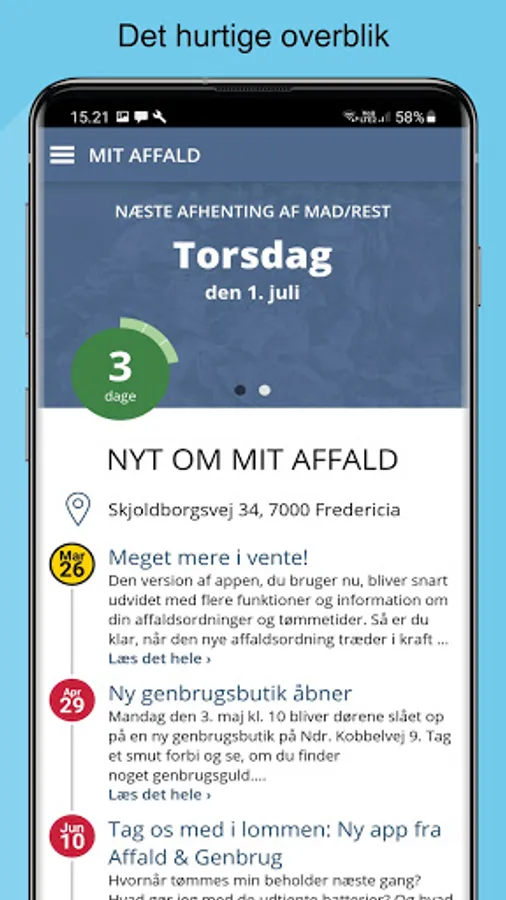 The purpose of the app, which is made available by Fredericia Municipality, is to provide citizens with a tool that will make waste management and recycling more efficient.