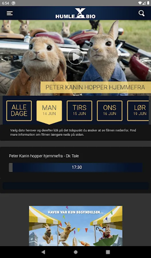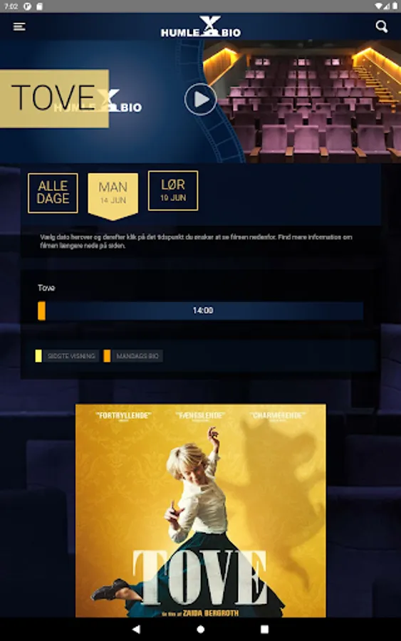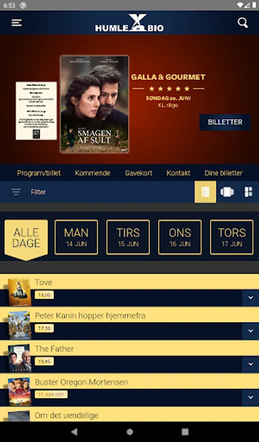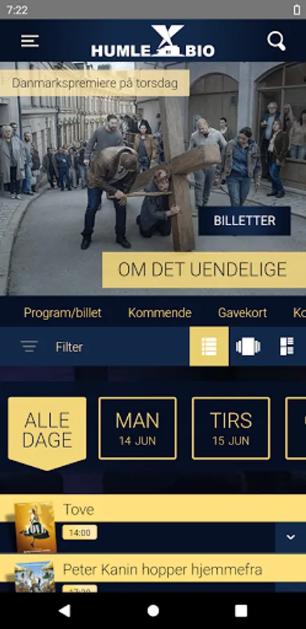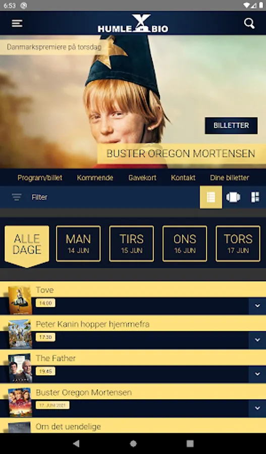 Film and program for the cinema in Humle Bio. See the cinema's program, movie reviews, trailers, etc. Buy cinema tickets that are delivered directly to your phone. You do not have to worry about starting your PC or printing your tickets - it does not get any easier. You can go directly to the hall and just show the inspector your phone.
