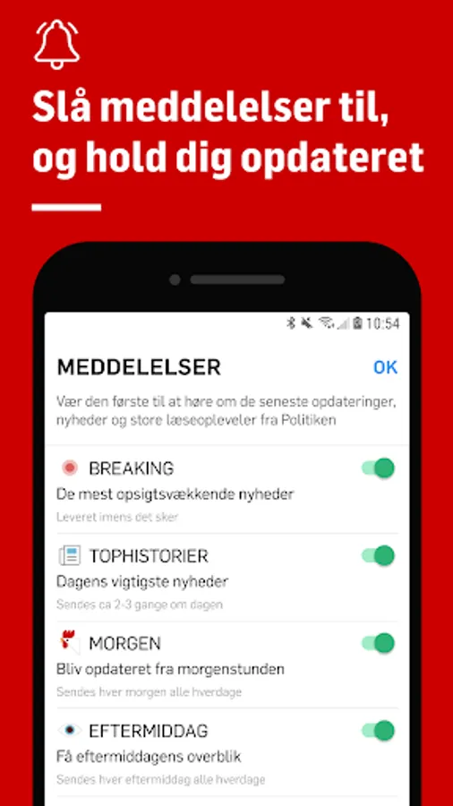 • Messages: You can receive messages that keep you updated throughout the day. You choose between breaking, top stories, morning overview, afternoon overview and weekend overview.