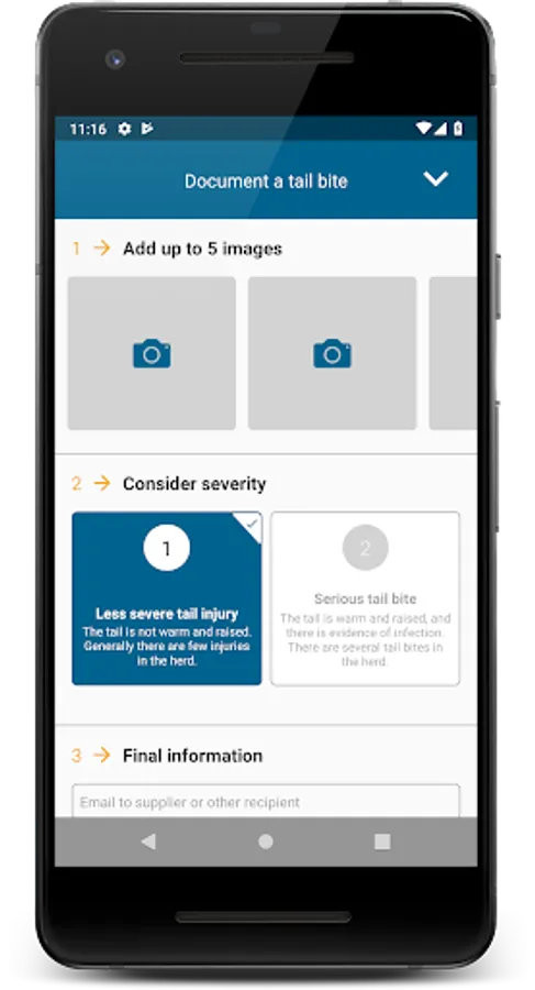 New EU rules set new and stricter documentation requirements for tail docking in pig herds. With this app you can easily and quickly photo document tail bites in your herd to your supplier and carry out your own risk assessment and thus safely and easily comply with the documentation requirements.