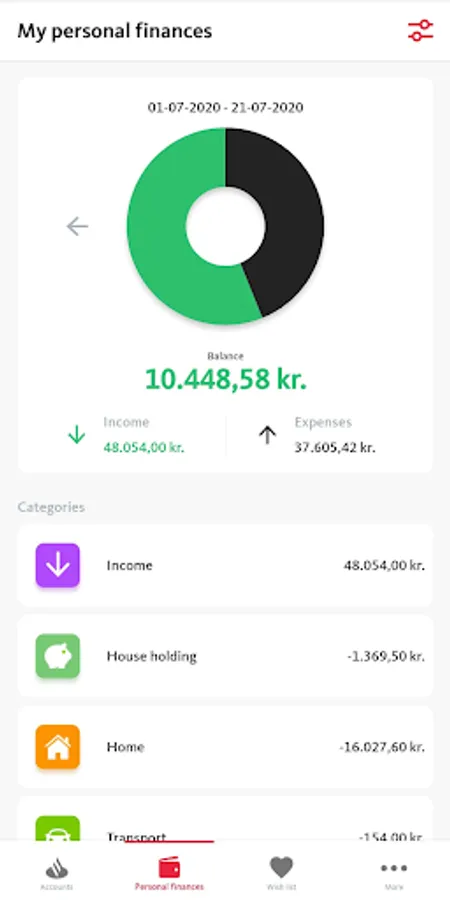 Her får du et samlet overblik over din personlige økonomi. Tilføj dine kreditkort og følg med i hvad du bruger dine penge på. Hvor meget går til madindkøb, og hvad bruger du af penge på shopping med vennerne? Få et større indblik i hvad dine penge går til, samt hvornår du har brugt dem. Ofte kan mindre omkostninger i hverdagen skæres fra og give dig flere penge på længere sigt.