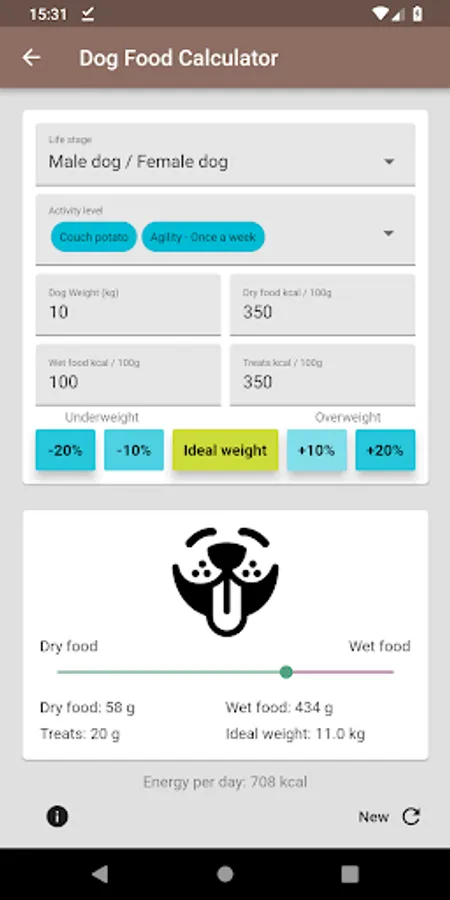 Based on weight, life stage, activity level and goals for everyday weight management, this SmartApp provides a personalized recommendation for the daily calorie intake for your dog.