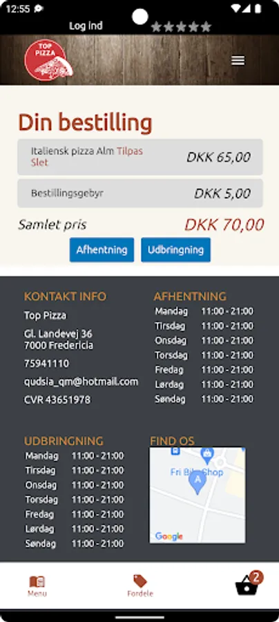Easy ordering of food from Top Pizza Fredericia. You can pay directly in the app.