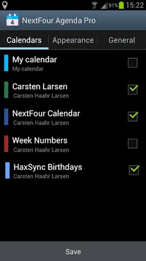 - Select which calendars to show events from.