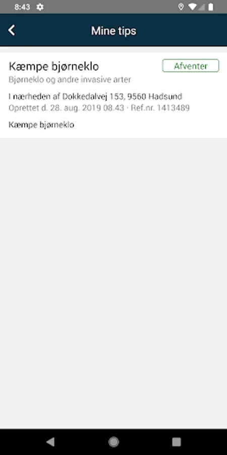 You have the opportunity to follow the status of your tips. Select "My tips" from the menu from where you can see your reported tips, status and any comments from Aalborg Municipality