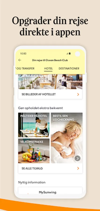 Once the trip is booked, perhaps the most fun begins. In the app, we count down to your holiday with you and make sure you have everything you need before the trip. You log in with the same email address and password as on Spies.dk, and you can also share the trip with your fellow travelers, so that you can look forward to the upcoming holiday together. In the app, you also have the option to upgrade your trip - perhaps a little more luxurious flight food, really good seats on the plane or a welcome pack waiting in your room when you arrive.
