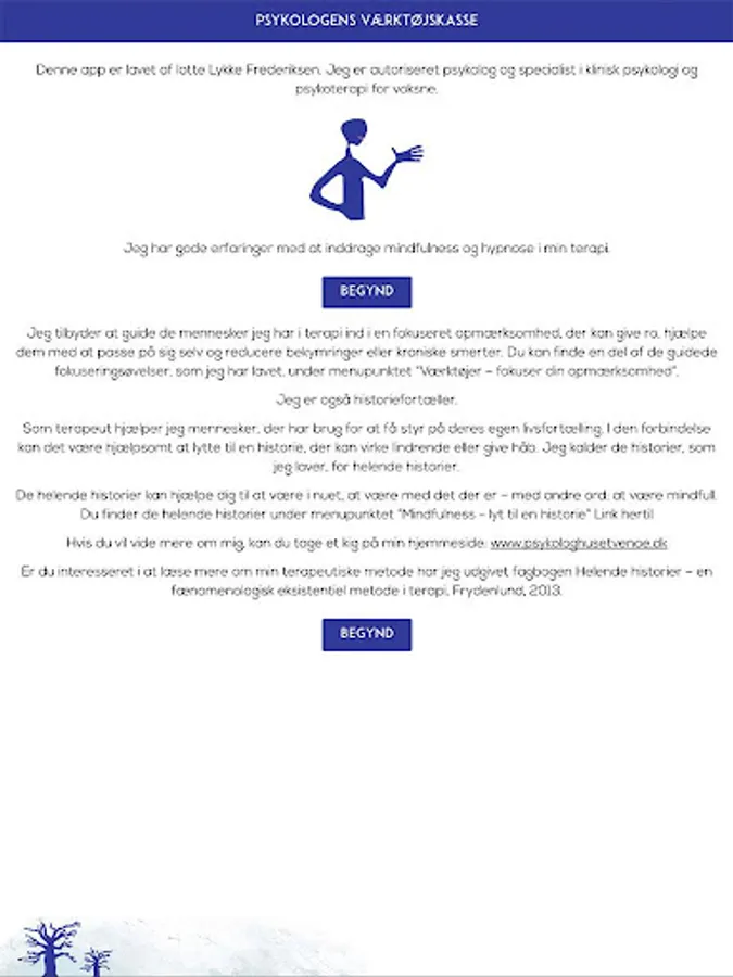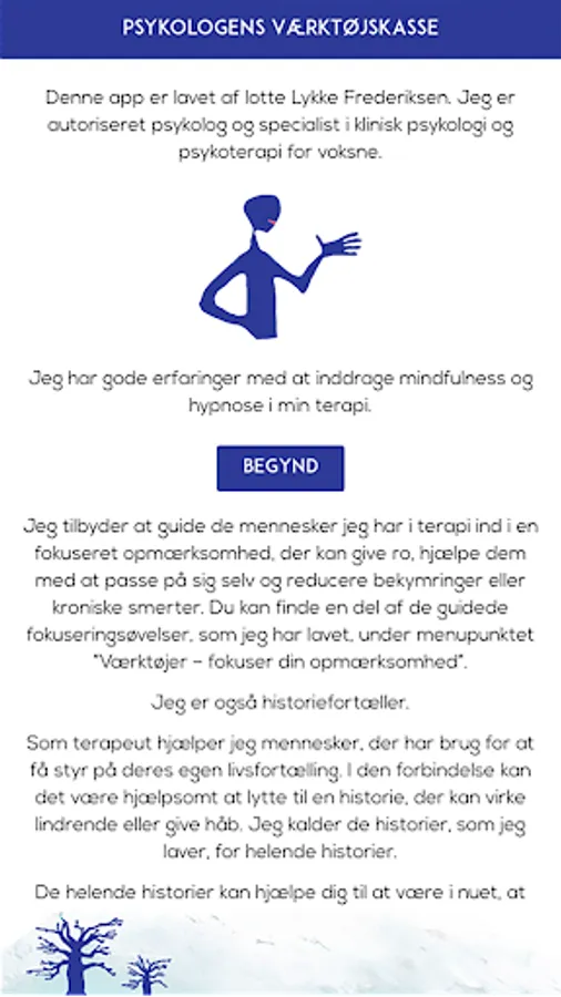 This app is made by Lotte Happiness Frederiksen. I am licensed psychologist and specialist in clinical psychology and psychotherapy for adults.