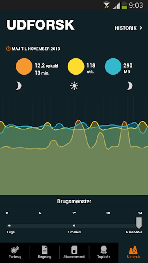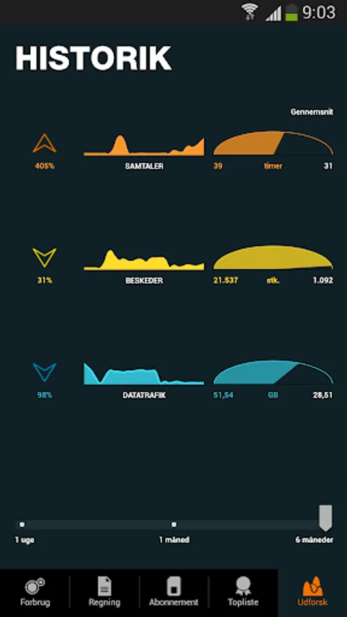 Check your average consumption and historical development for up to 6 months back in a nice graphic presentation. For example, you can see when the day you use the most data or call the most.