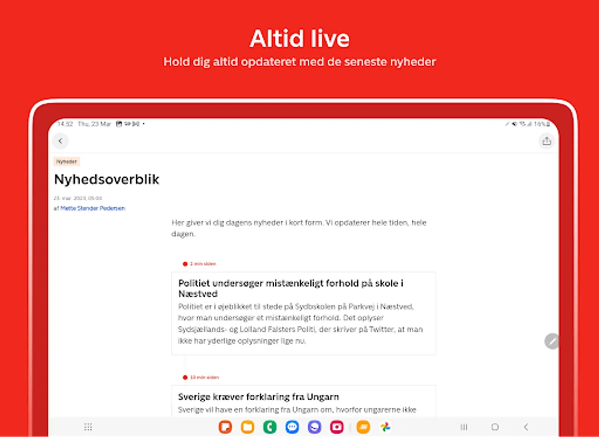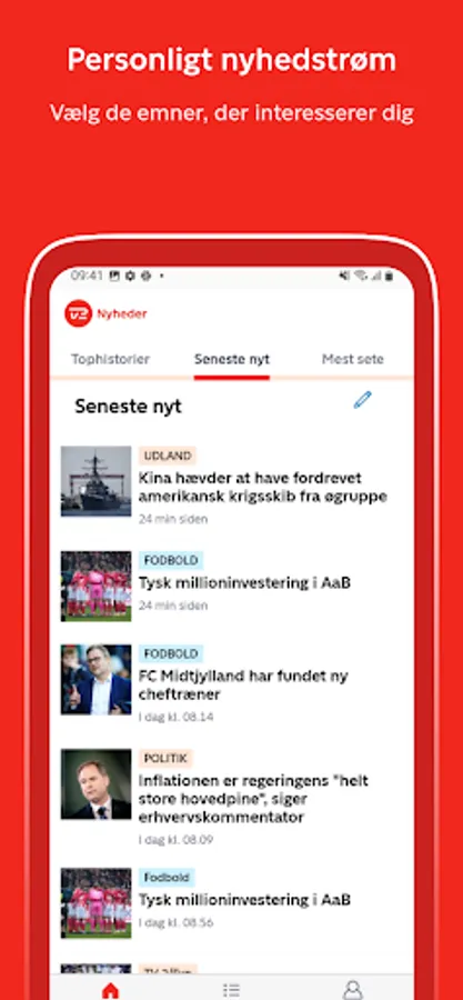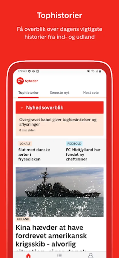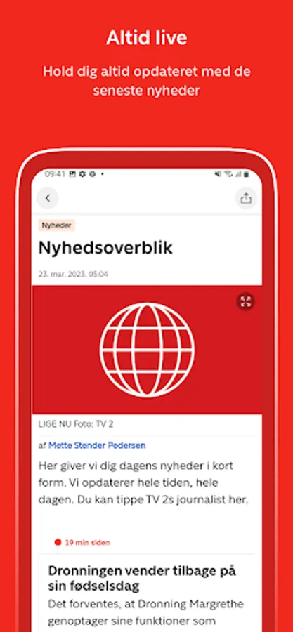 TV 2 Nyheder gives you the full flow of news in text, images and video on your phone or tablet. Both the latest news and breaking news from in and outside of Denmark.