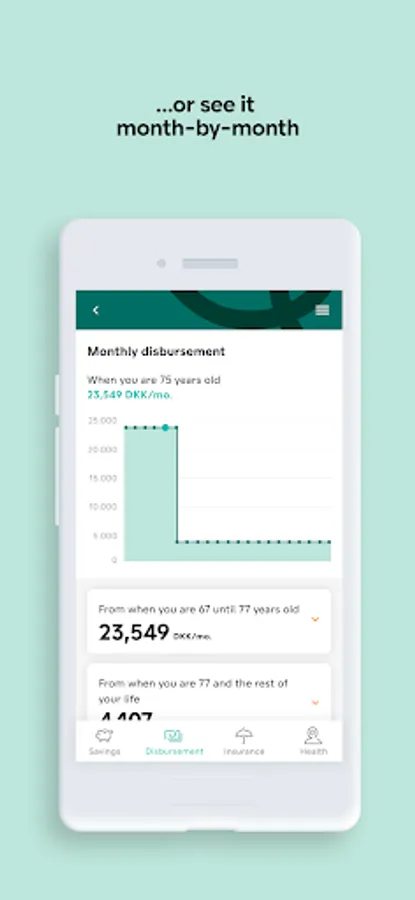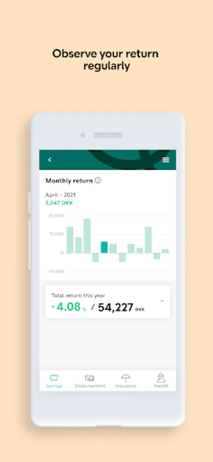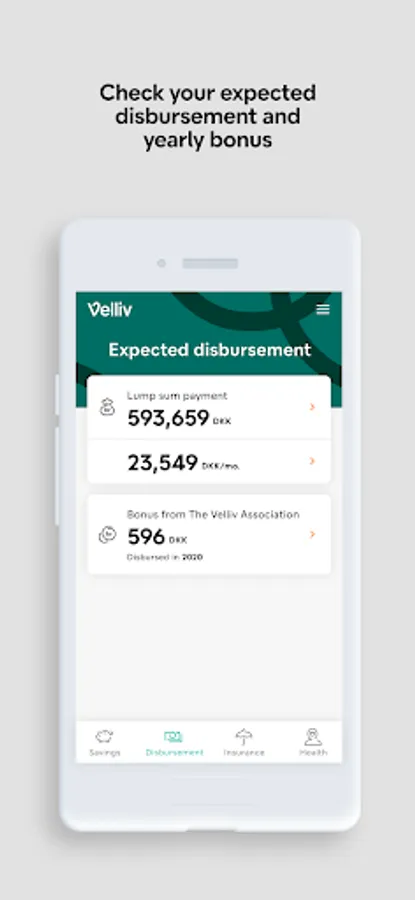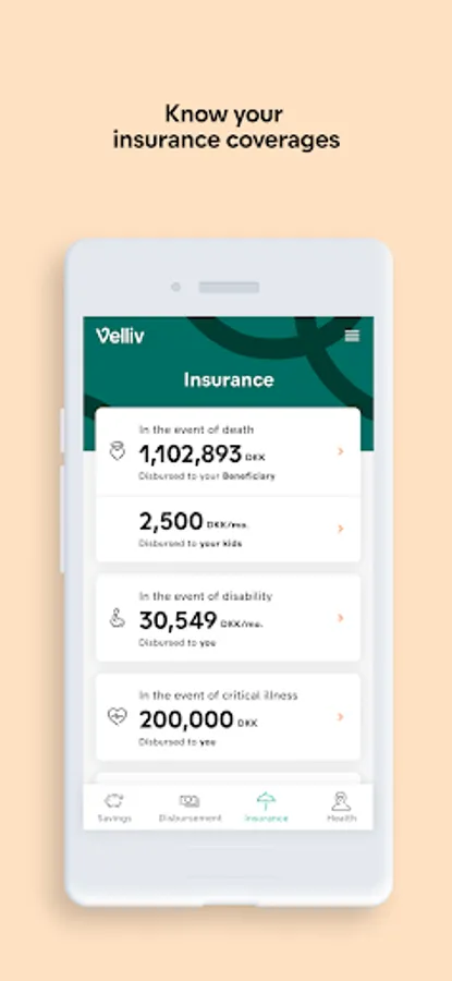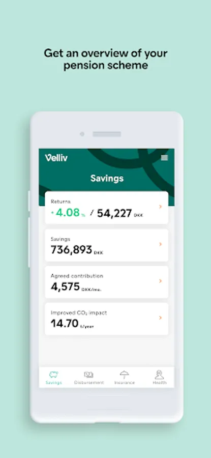 In the app, you will be able to follow your contributions and the return on your investments. You can keep yourself updated regarding the development of your savings and see what disbursements you might expect from Velliv when you retire. Also, you can get an overview of your insurances in the event of death, illness, and disability.