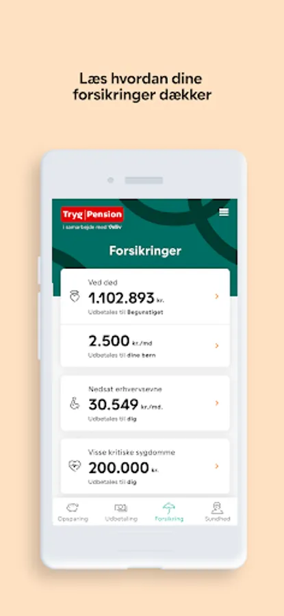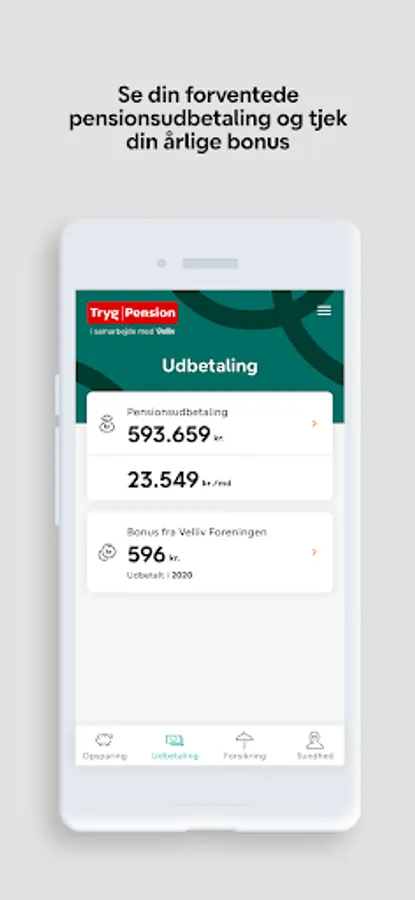 The app gives you an overview of your pension scheme at Tryg Pension in collaboration with Velliv: