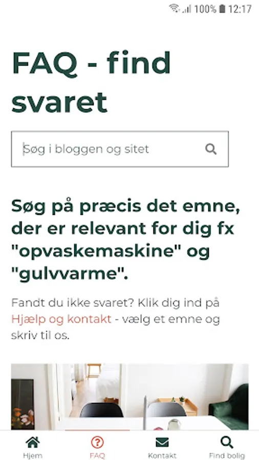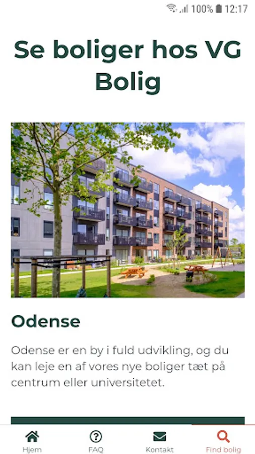 VG Bolig offers rental housing in major Danish cities - our mission is to give you a proper place to live. Quick and easy access to contact us and get help is important to us. Via our app you can therefore contact us regarding