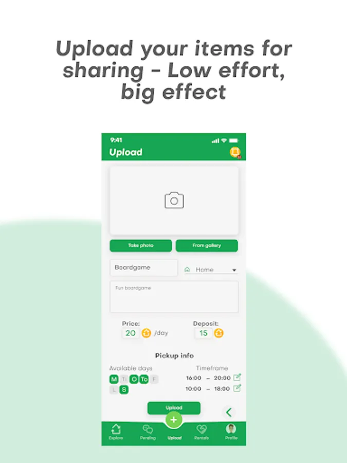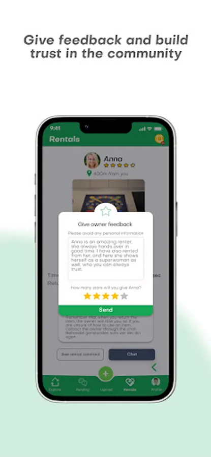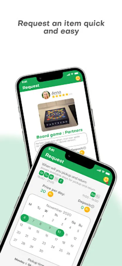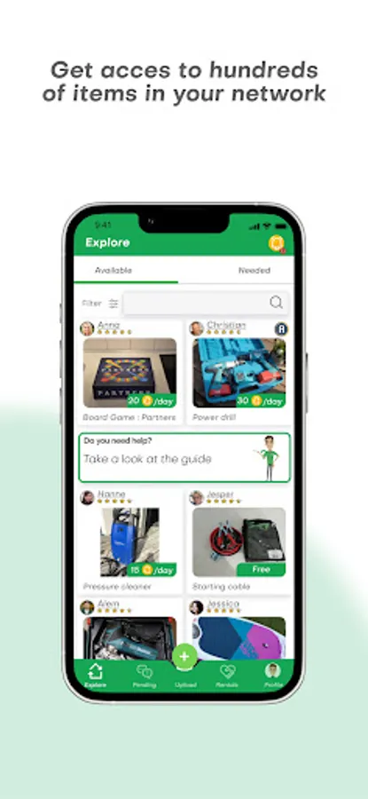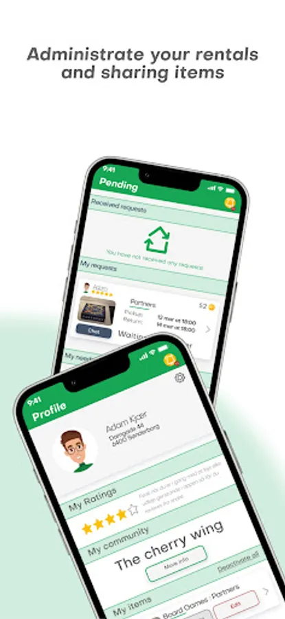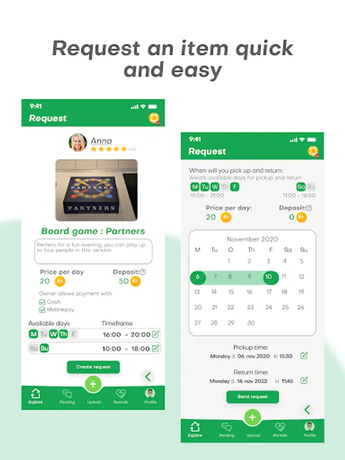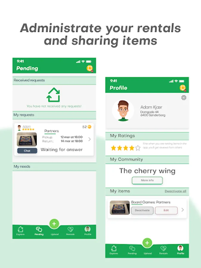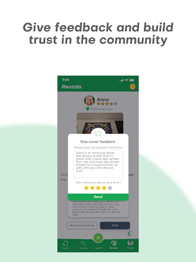 Your safety is at top priority for us! That's why the app automatically creates a rental contract with the ability to add extra notes before you start the rental with a simple swipe, this can be used as documentation for a relevant insurance (In Denmark your home insurance). Our in-app review system provides you with information about previous rental experiences from users, rated by the community. To further increase trust on our platform, both renter and item owner give each other reviews after each interaction.