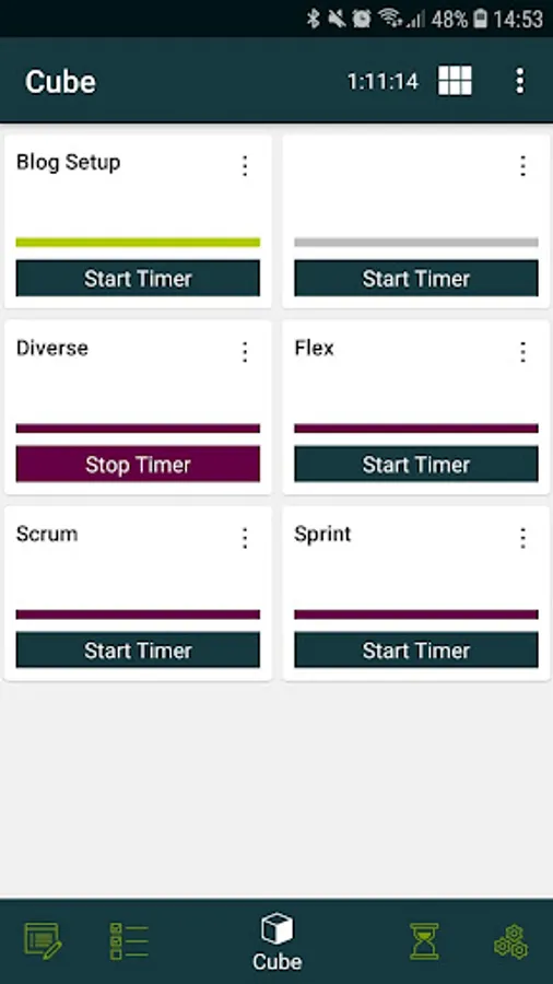 On the virtual cube you are able to assign the tasks that you want to focus on and change the colour of the tiles, while also being able to clear them once you're finished. By pressing the tile you start the timer of the task and by pressing again you stop the timer. A pop-up shows up with the worked hours, suggested billable hours, the choice of it being billable or not and a mandatory text field to describe what you've been doing. You can choose to park the registration and it will be sent to the time list for later completion or you can choose to hit send, and your time registration will be sent off to the back office. Now the timeregistration will be visible in the timelist under the task itself. If you chose to park your timeregistration, you can go to the timelist where you are able to merge timeregistrations based on the task, that were created on the same date.
