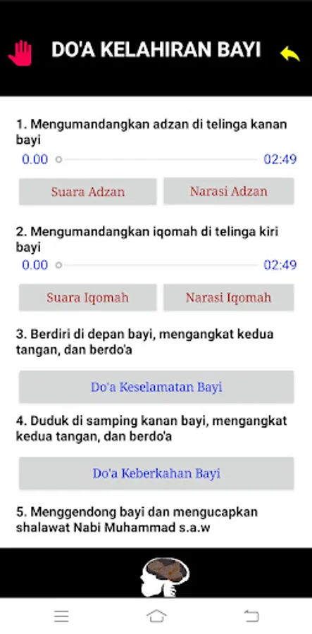 This application contains guidance for reading prayers in welcoming the birth of a baby. Starting from the minimal stage (stages 1 and 2) to the advanced stages (stages 3 and 4). All parts of the stages contained in this application have sunnah legal status.