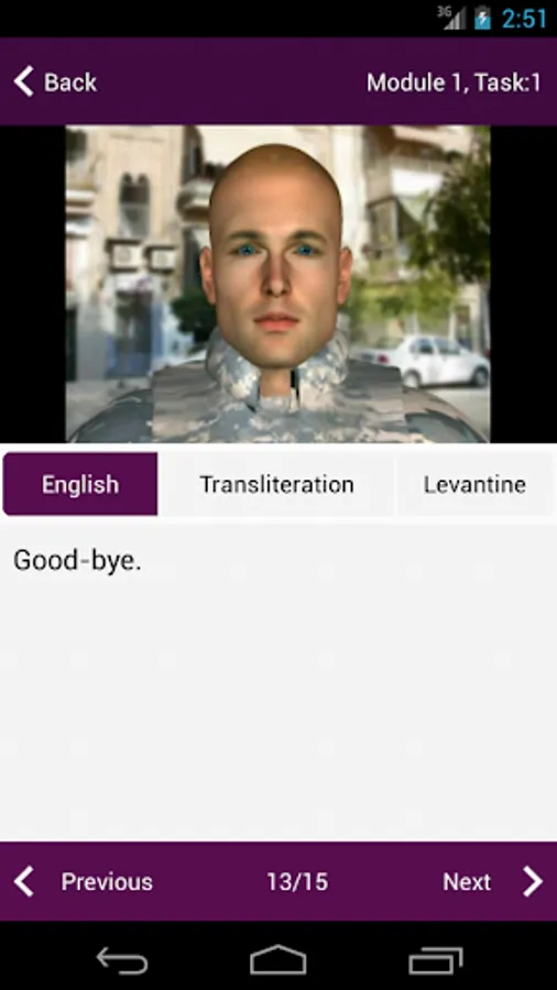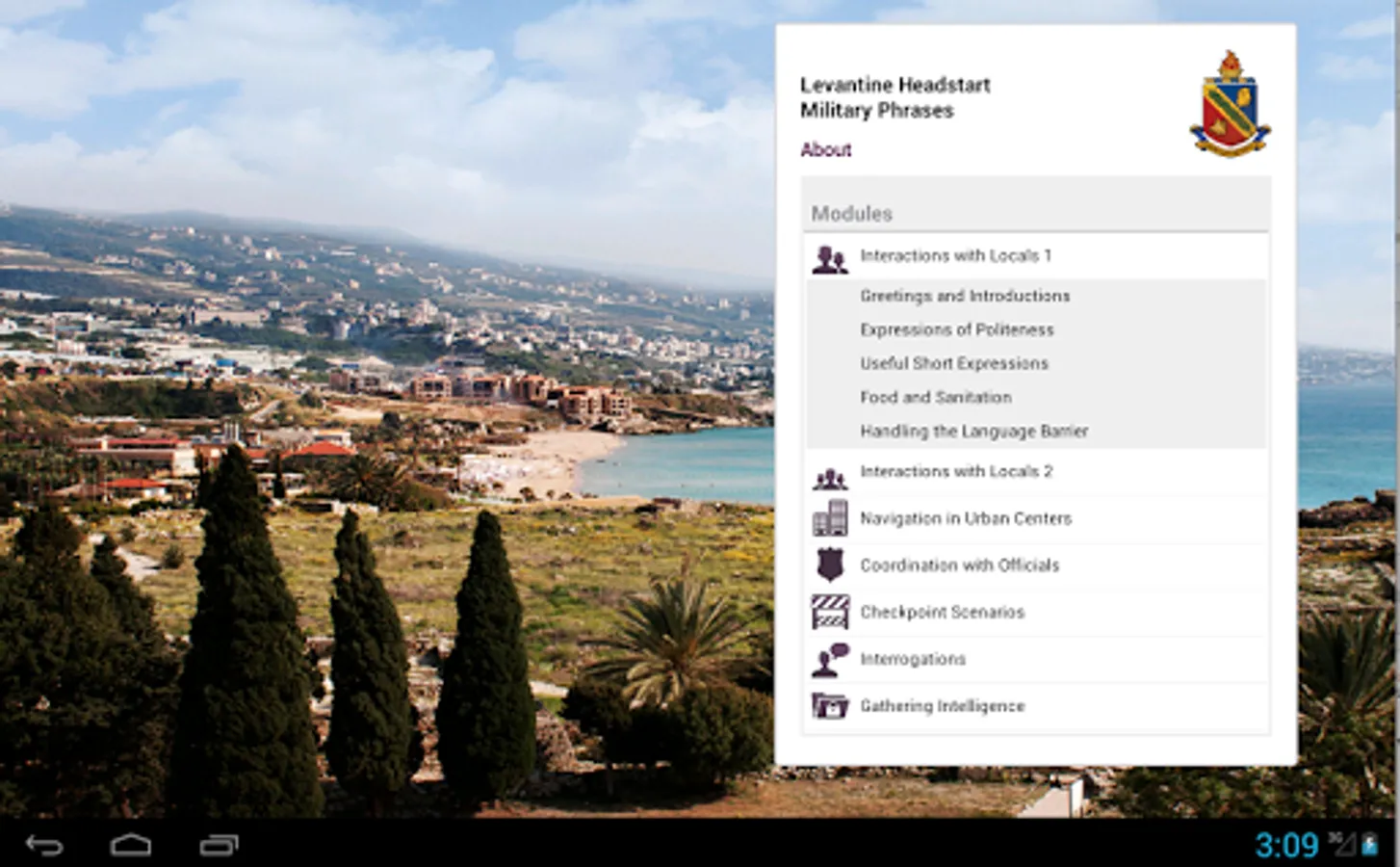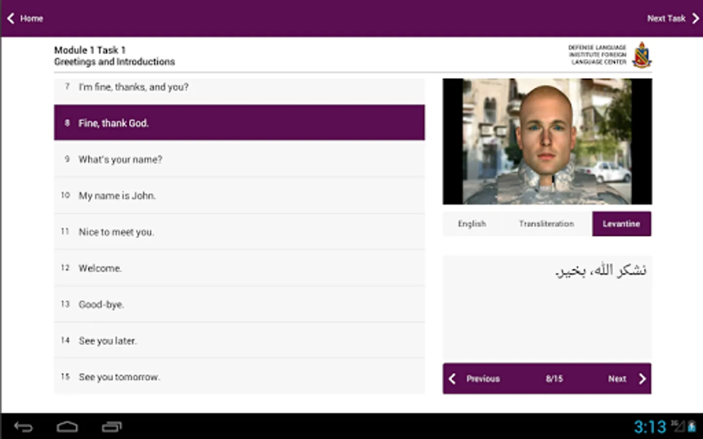 The Headstart2 Military Phrases app exposes users to 50 mission-specific tasks containing 750 terms and phrases. These tasks include vocabulary covering public safety, medical situations, basic command, cordon and search, and even gathering intelligence. Headstart2 provides users with important communication tools that are needed in preparation for deployment. The material was developed by the Technology Integration Division of the Defense Language Institute Foreign Language Center in Monterey, California.