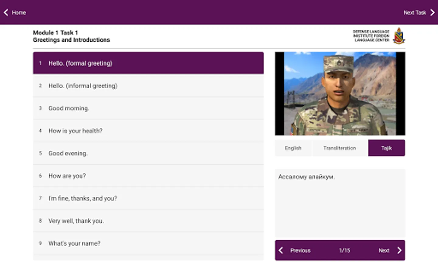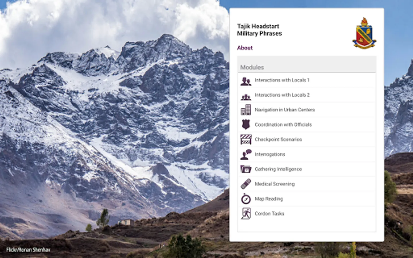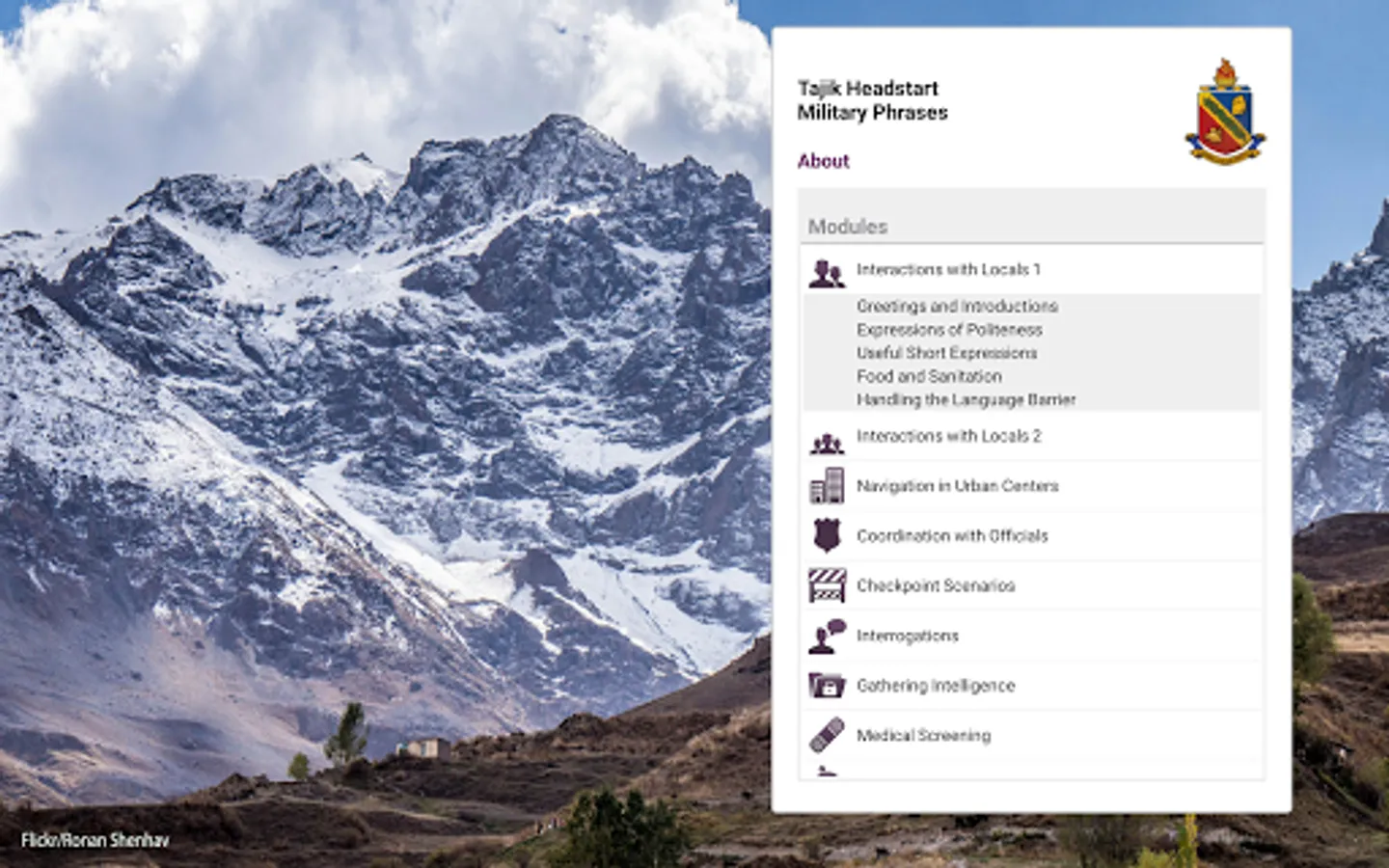 The Headstart2 Military Phrases app exposes users to 50 mission-specific tasks containing 750 terms and phrases. These tasks include vocabulary covering public safety, medical situations, basic command, cordon and search, and even gathering intelligence. Headstart2 provides users with important communication tools that are needed in preparation for deployment. The material was developed by the Technology Integration Division of the Defense Language Institute Foreign Language Center in Monterey, California.