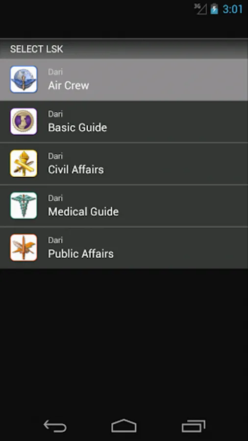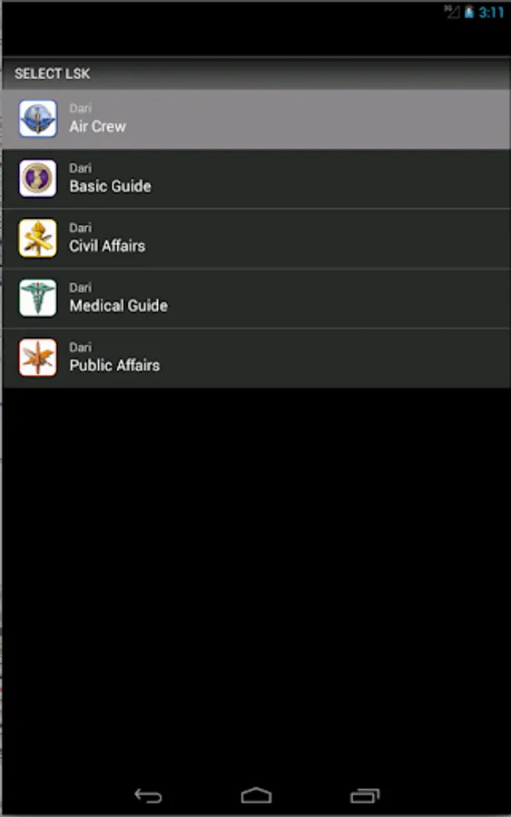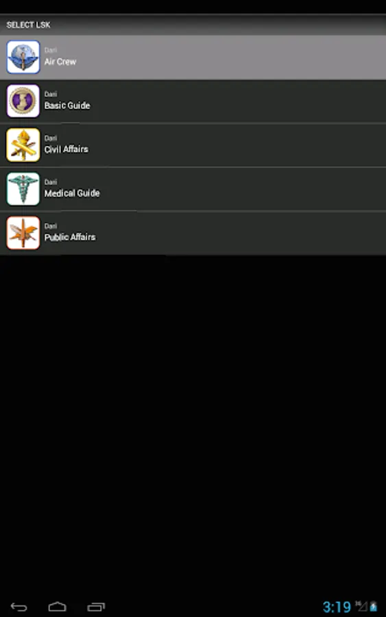 This is the Dari LSK. Language Survival Kits (LSKs) are designed as a quick reference available in 5 to 6 different topics per language for deploying service members. The LSKs contain mission-specific vocabulary and simple phrases in topics.