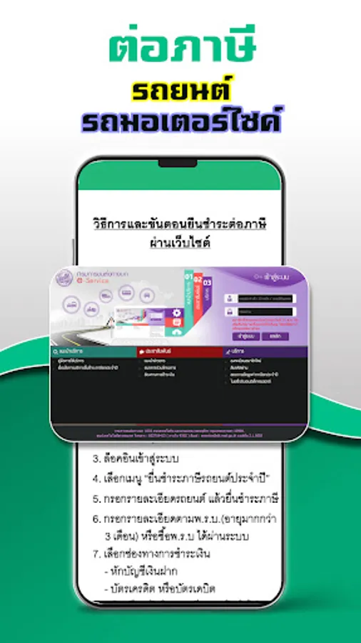 We are an application that helps information Steps to renew the annual car tax through the online system of the Department of Land Transport near you I would like to present with descriptions, pictures, summary of methods for you to understand and do it yourself at home. If you want to know the price, fees and pay the car tax by yourself Through the e-Service system website, both new cars aged not over 7 years and private cars aged over 7 years