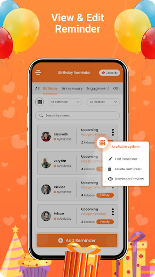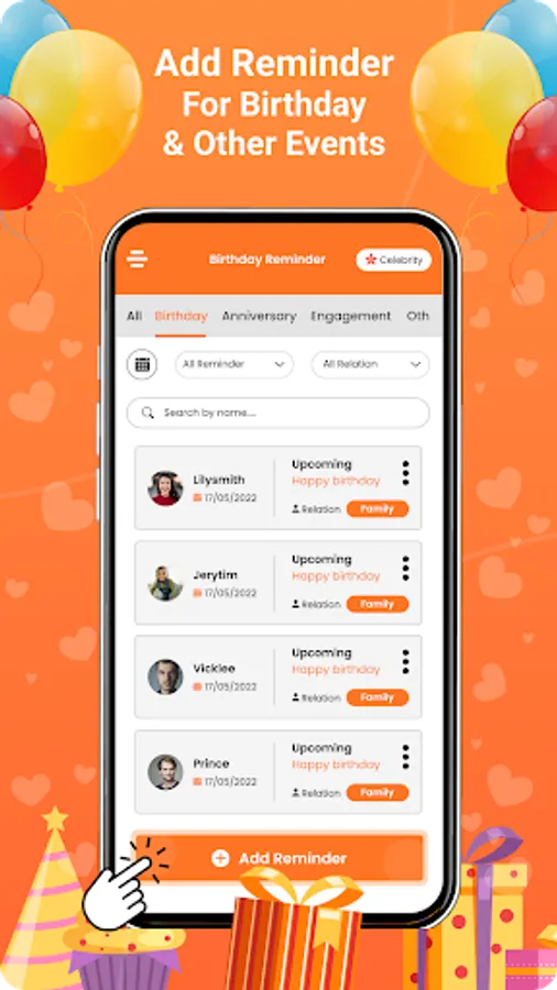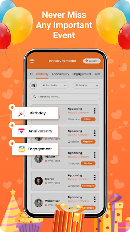 Birthday countdown app & reminder app to set reminders for the upcoming birthdays, anniversaries and other events.
