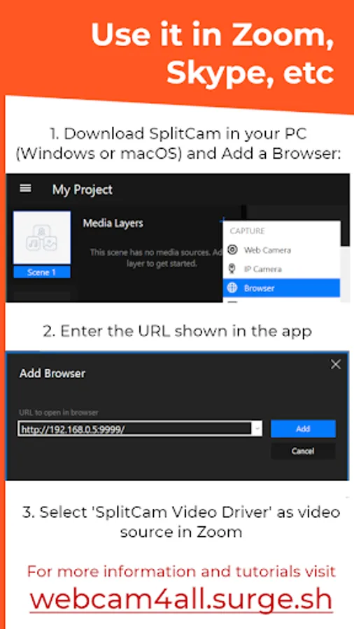 Download SplitCam in Windows or mac for free and enter the URL shown in the app. Then, simply select 'SplitCam Video Driver' as the video source in zoom or any other program.