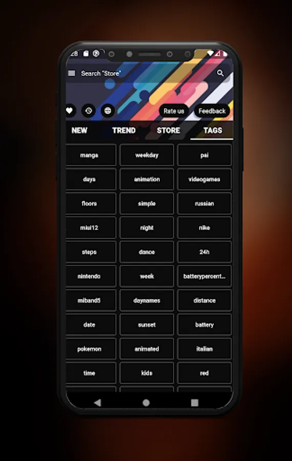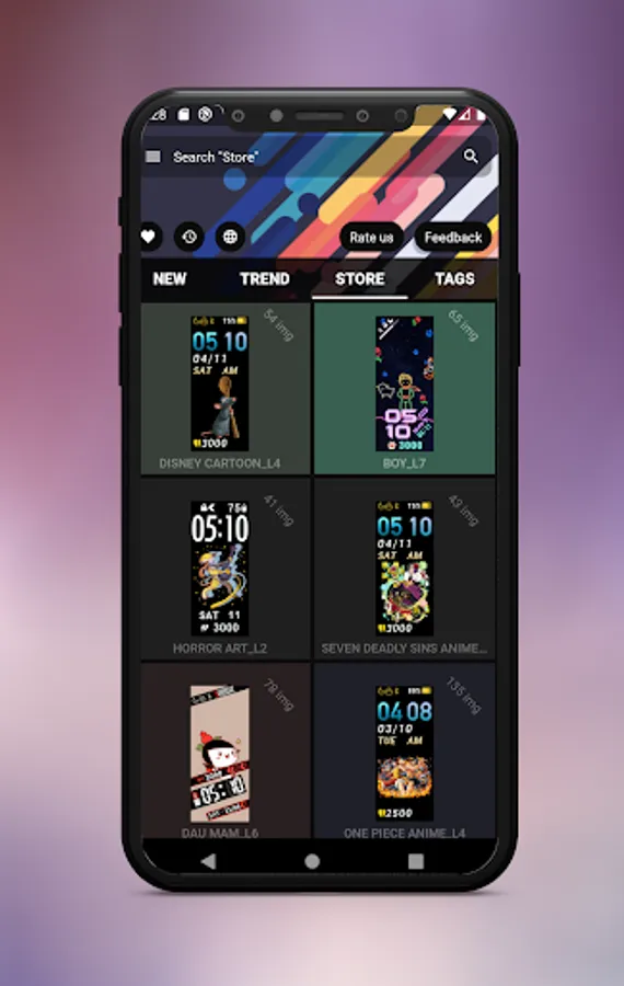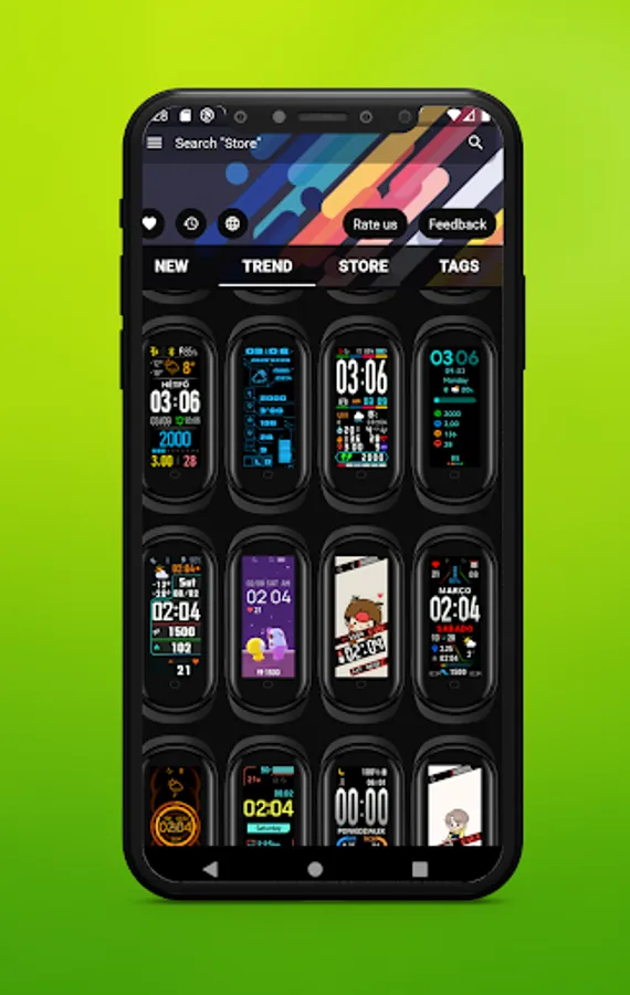 + Home layout of the app has 4 tabs: NEW, TREND, TAG, STORE. NEW displays the new images Mi Band 5. TREND displays the images Mi Band 5 which many people views. YOURS displays the images Mi Band 5 watchfaces which you like. STORE display all images Mi Band 5 watchfaces in the app as albums.