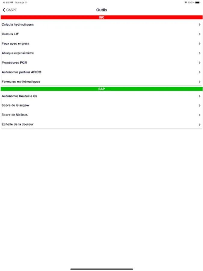 • Operational tools: hydraulic calculations, LIF, fires with fertilizer, exploit chart, mathematical formulas, O2 and ARI cylinder autonomy, PGR procedures, pain scale