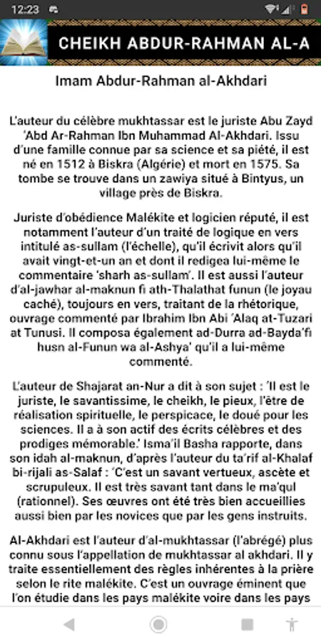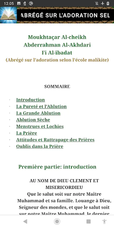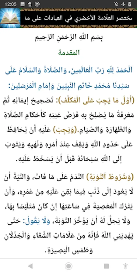 We have developed this application to facilitate access to knowledge for learners who seek to better practice their religion. The Mukhtasar of Abdur-Rahman al-Akhdari is of crucial importance to the Muslim world, especially in northern and western Africa, as it is considered the first step for any student seeking to understand the fundamental rules of ritual purification and prayer according to the Maliki school of jurisprudence.