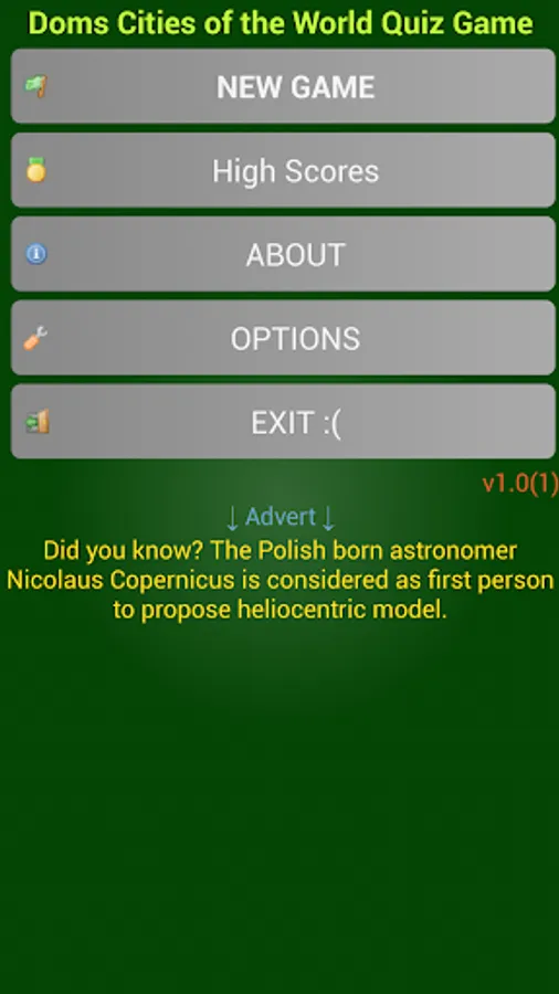 * Easy to play classic quiz games . that you answer on questions about country of the world , capital of the countries , flags of the world and regions where country are.