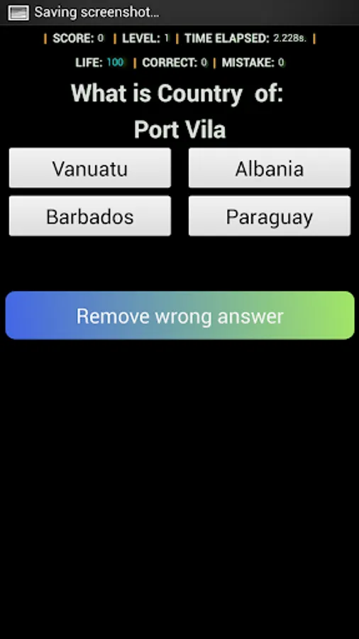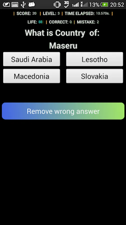 I wrote https://play.google.com/store/apps/details?id=dms.pastor.cccfQuizGame ages ago. It is similar game but it focus on major cities in all countries in the world. It is a classic game based on concept like: multi choice quiz games , pub games , national flags quiz game , TV quiz shows , trivia games , countries of the world , capitals of the world , flags of the world , 4 Pics 1 Word and etc. However. I just don't want copy and paste other games. I decided to add a unique "arcade mode" , where you mix questions from countries of the world , capitals of the world , national flag and region with random events to make game more interesting.