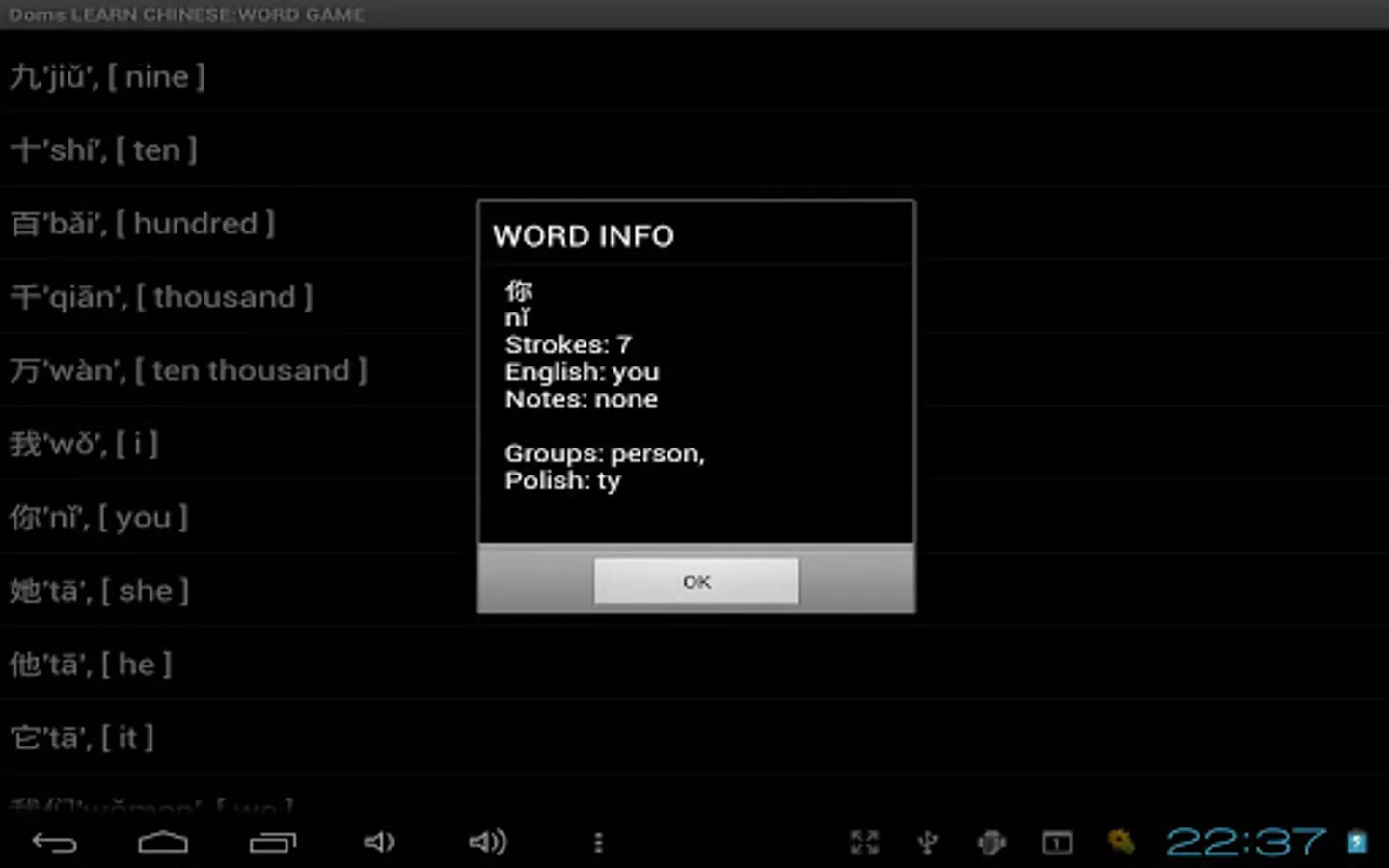I wrote this game to help myself learning Chinese with focus on learning simplified Chinese characters (known as Hanyu or logograms), memorise words, radical, stroke, phrases and pinyin (to help pronounce characters).