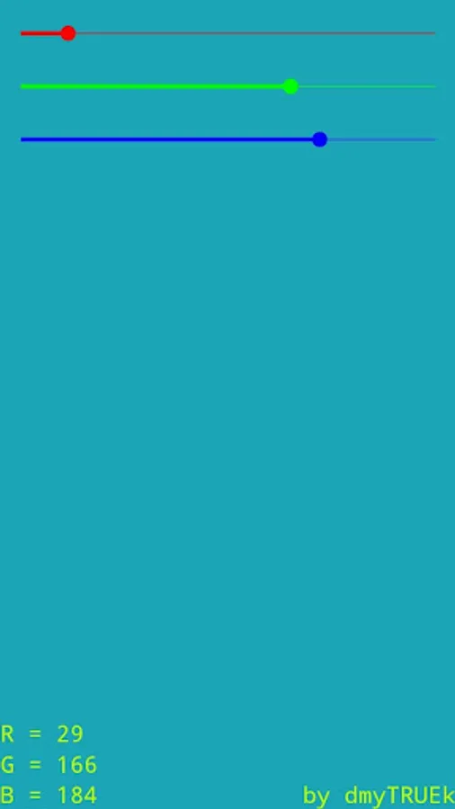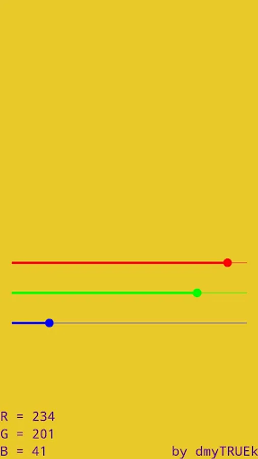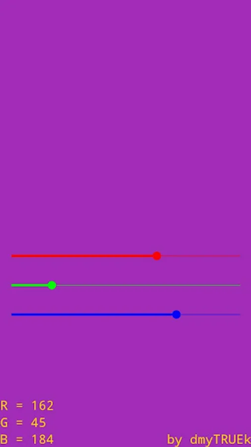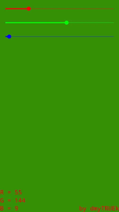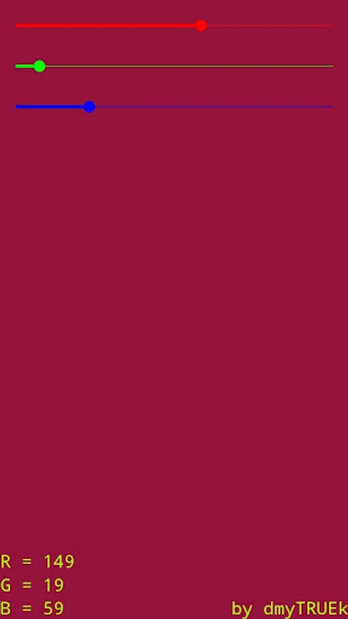 Minimalistic program to mix colors by RGB. From black to white, from blue to red, from green to brown and all other colors. Swipe down to get scroll bars down and swipe up to get scroll bars up.