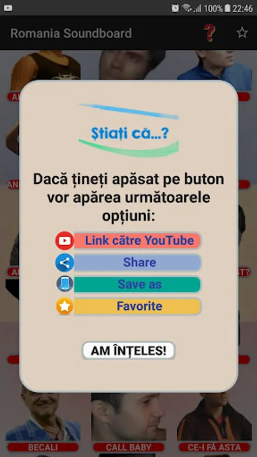 The app has options like: "Link to YouTube", "Add to favorites", "Save" and "Send". So you can send the sounds directly to Whatsapp to amuse your friends too!