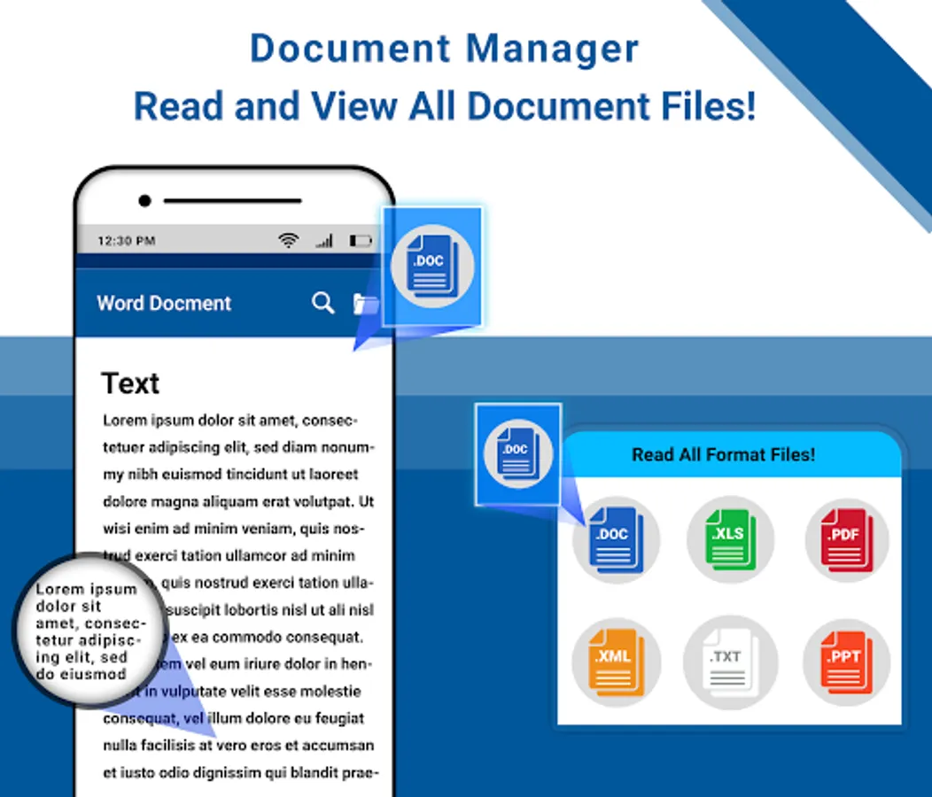 Docs Reader ๐ Manage all your documents Now you can get the best manager for your phone that can assure you to read all the document files of all the extensions easily. All Document Reader ๐ Files Reader and Office Viewer allow you to view and read all document files on your mobile. You can open documents that are stored on the internal memory or even downloaded files or those sent as email attachments and you can open any document with this document file viewer when you are on any other app.
