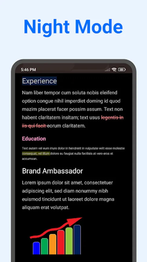 Read any Docs file with a simple and elegant reading screen that has essential controls. Like rename, share, print, landscape view, delete, and dark mode.