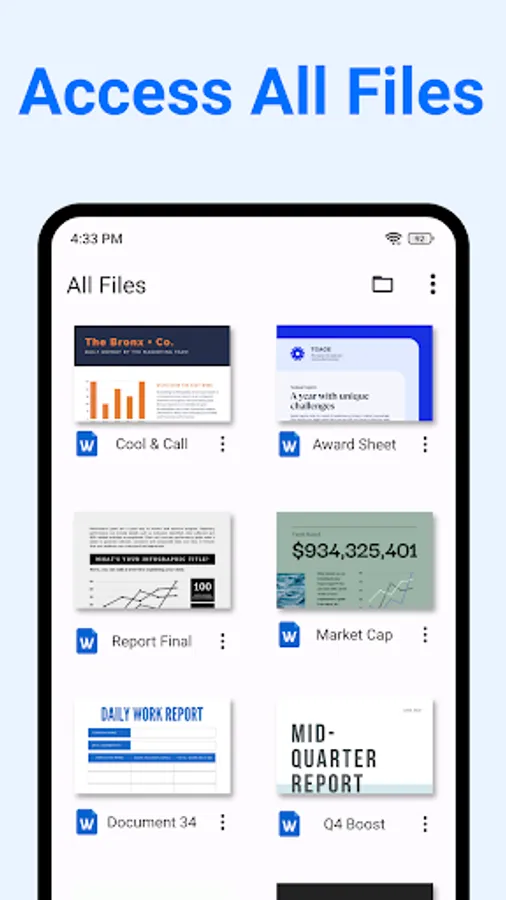 Office file reader app helps to open docs files, view documents, and manage all documents. The document viewer app helps to open all files or view any word document file on your mobile device. Import documents into the app and make them instantly readable, including Word editor and PDF files. Open your work files in .docx, .doc, word doc format. Easily open all documents without the Internet. Manage documents in the offline reader and view Docx anytime, anywhere.