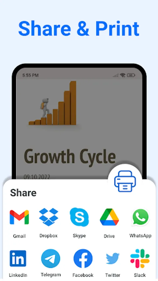 All docs reader app has a unique feature to print documents. Just select the docs print you want in the office app. All printer options are available in the word office app.